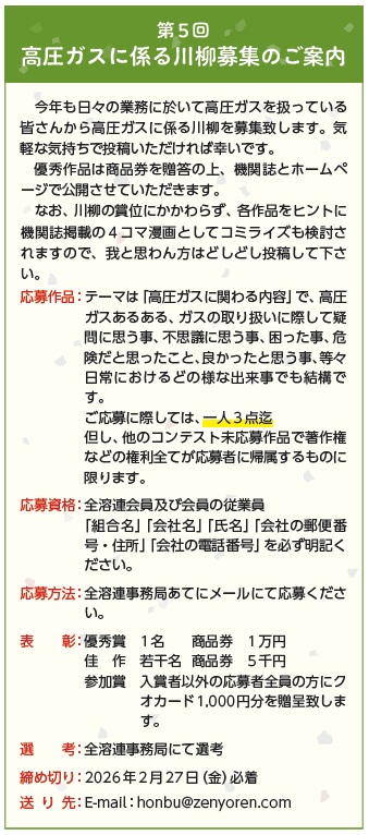 今年も日々の業務に於いて高圧ガスを扱っている皆さんから高圧ガスに係る川柳を募集致します。気軽な気持ちで投稿いただければ幸いです。優秀作品は商品券を贈答の上、機関誌とホームページで公開させていただきます。